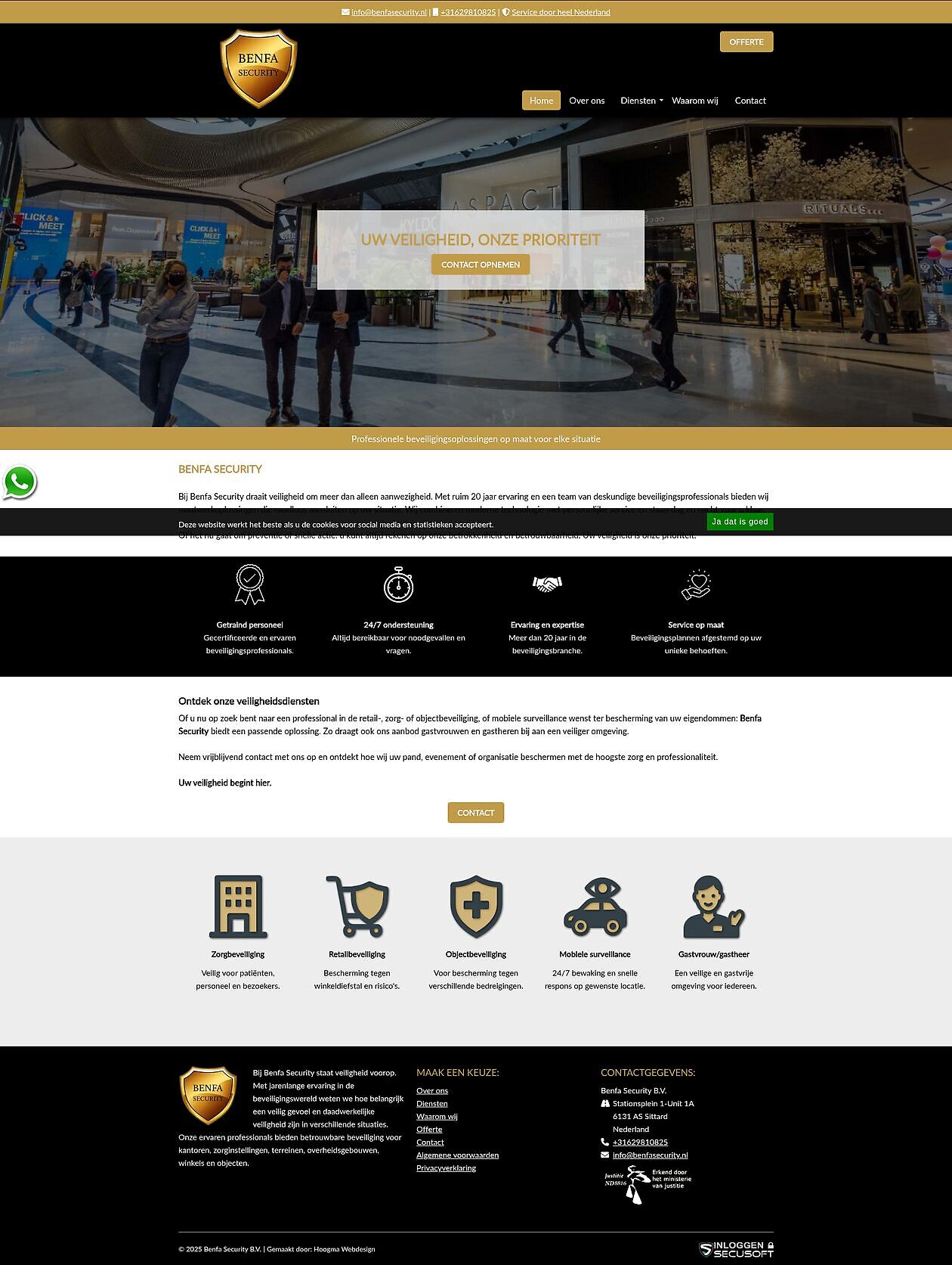 Voor Benfa Security realiseerden wij een moderne en stijlvolle website die perfect aansluit bij de kernwaarden van het bedrijf. Met ruim 20 jaar ervaring biedt Benfa Security deskundige beveiligingsoplossingen voor uiteenlopende sectoren, van zorg en retail tot objectbeveiliging en mobiele surveillance.