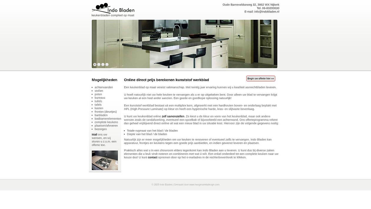 Para el proveedor de encimeras Indo Bladen de Nijkerk, realizamos un diseño básico para la página de inicio, adecuado para teléfonos móviles. Hemos desarrollado un complejo módulo de cálculo personalizado con el que el cliente puede calcular el precio de la encimera con todos los accesorios directamente online. Todos los pasos se guardan en la base de datos y la cotización puede enviarse por correo electrónico o imprimirse inmediatamente.