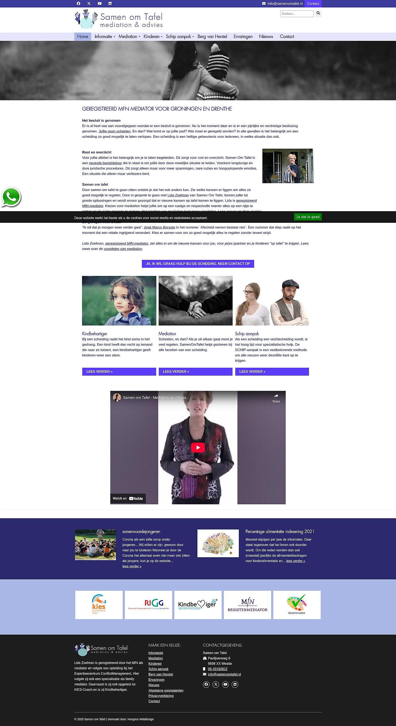 Hace un tiempo, creamos un sitio web completamente nuevo para Samen om Tafel Mediation & Advies from Wedde, y recientemente lo migramos a HWCMS. Esto facilita el mantenimiento del sitio web y lo hace compatible con dispositivos móviles y tabletas. Además, se ha incorporado un vídeo SWF que también se puede reproducir en Apple/Mac. Comenzaremos a trabajar en el marketing y la promoción online del sitio web para generar nuevos clientes potenciales a través de internet.